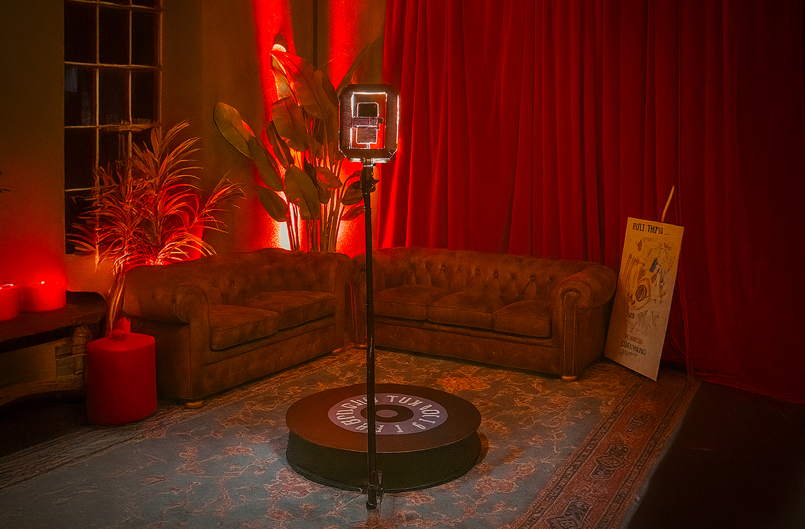 Il Social 360° è una struttura formata da una pedana e un braccio meccanico rotante che supporta un device dedicato alla registrazione di video ad hoc intorno all’utente in posa.